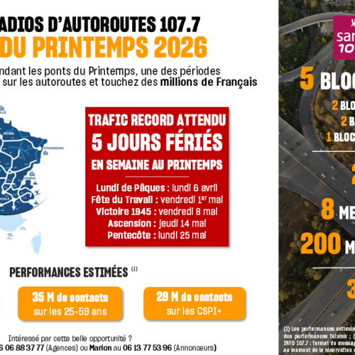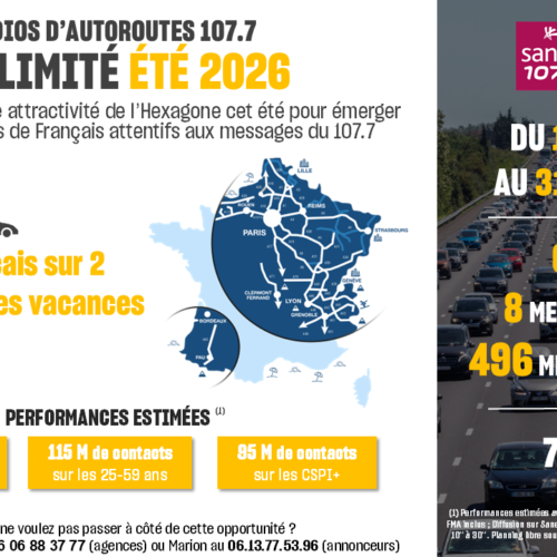 Les radios d’autoroute 107.7 offrent aux annonceurs des espaces publicitaires uniques. Chaque année, une grande majorité de de Français empruntent les autoroutes de France pour leurs trajets quotidiens ou pour partir en congés pour de courts ou de longs séjours.